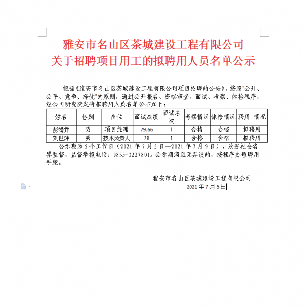 雅安市名山區(qū)茶城建設(shè)工程有限公司 關(guān)于招聘項目用工的擬聘用人員名單公示