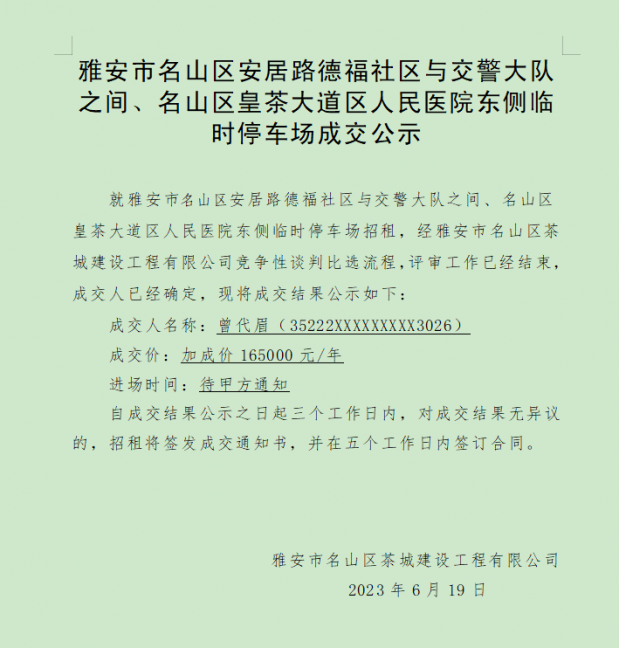 雅安市名山區安居路德福社區與交警大隊之間、名山區皇茶大道區人民醫院東側臨時停車場成交公示